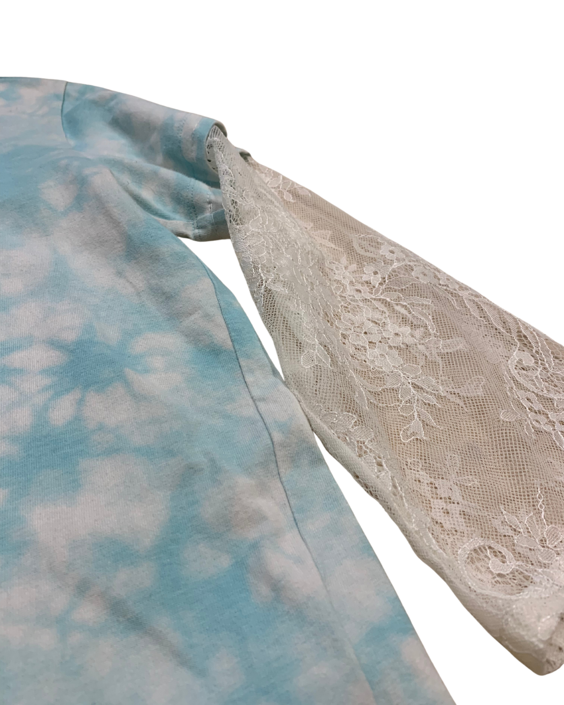T-shirt Champion rivisitata in chiave Y2K angel-core: tie-dye ghiaccio e maniche in pizzo avorio.