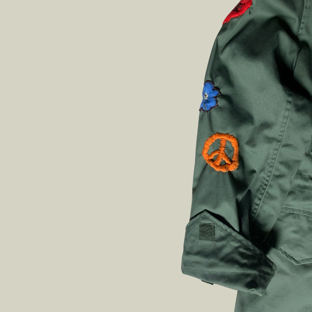 Giacca militare originale U.S. Army M-65 Field Jacket, taglia Large Regular, reinterpretata in chiave hippie/peace movement con ricami artigianali realizzati a mano.