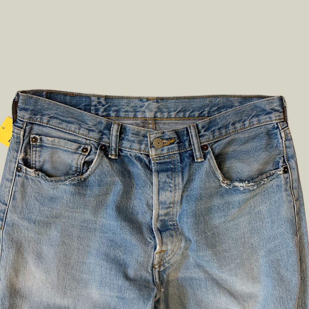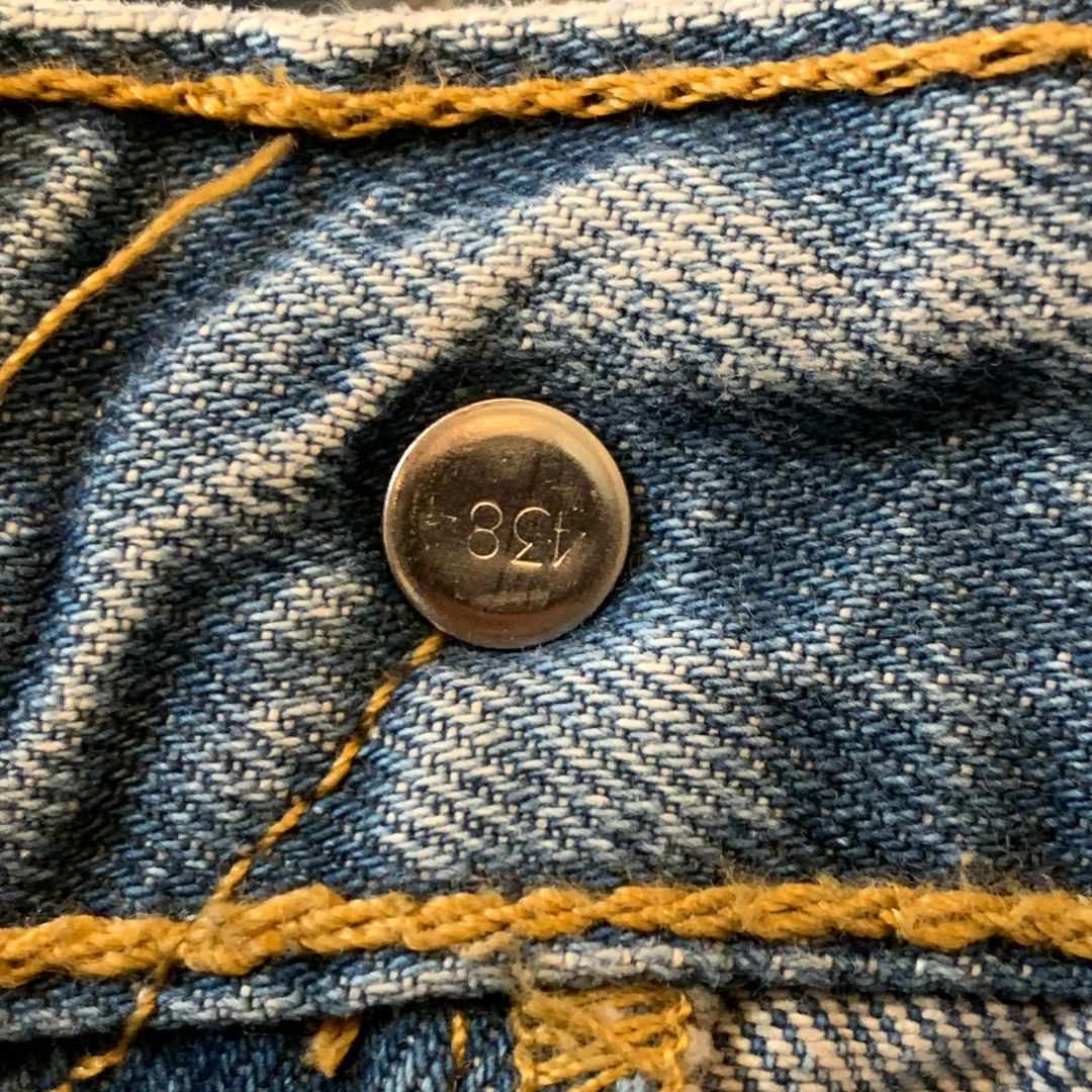 Lavaggio chiaro vintage, usura autentica su tasca e orlo inferiore (vedi foto).
