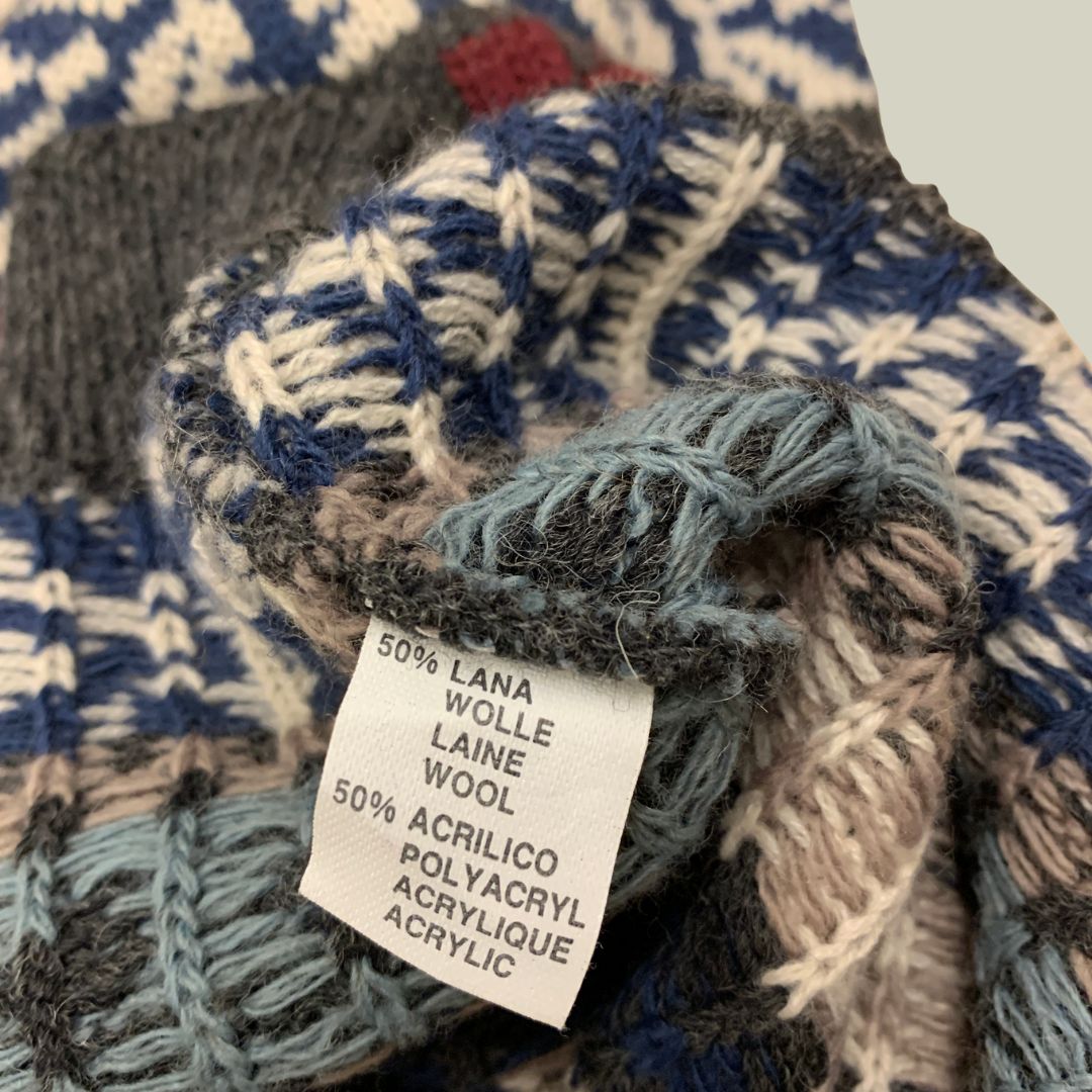 Maglione vintage a girocollo firmato Gio Ferrari, realizzato in filato misto lana e acrilico. Caratterizzato da un motivo jacquard a righe e geometrie multicolore nei toni del blu, grigio, bordeaux e panna. Collo, polsini e fondo a costine. Vestibilità comoda, ideale per outfit casual e rétro.