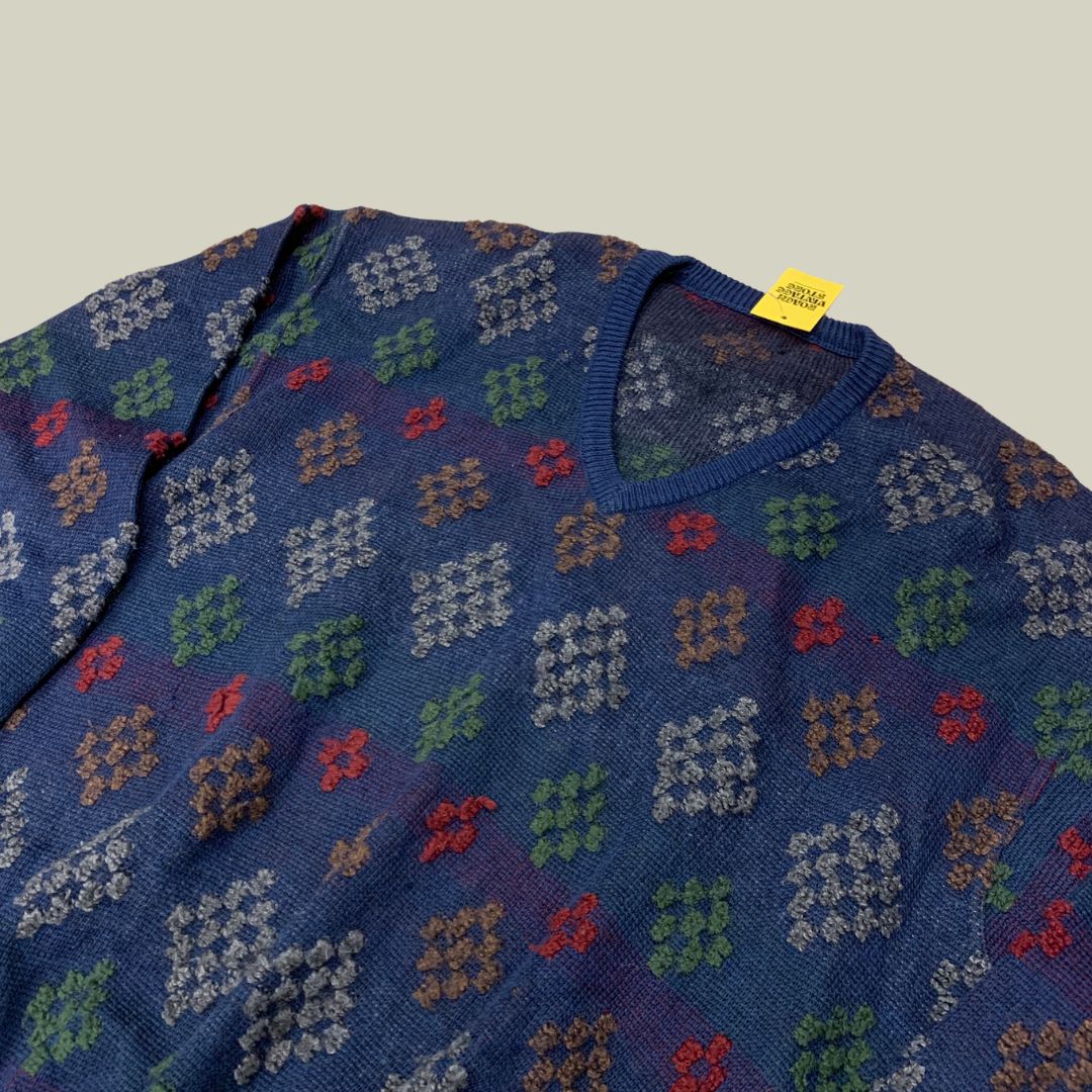 Maglione vintage con scollo a V, caratterizzato da una fantasia geometrica multicolore su base blu. Capo caldo e morbido, dal gusto retrò, ideale per look casual, vintage o preppy. Produzione italiana, con lavorazione di qualità e vestibilità comoda.